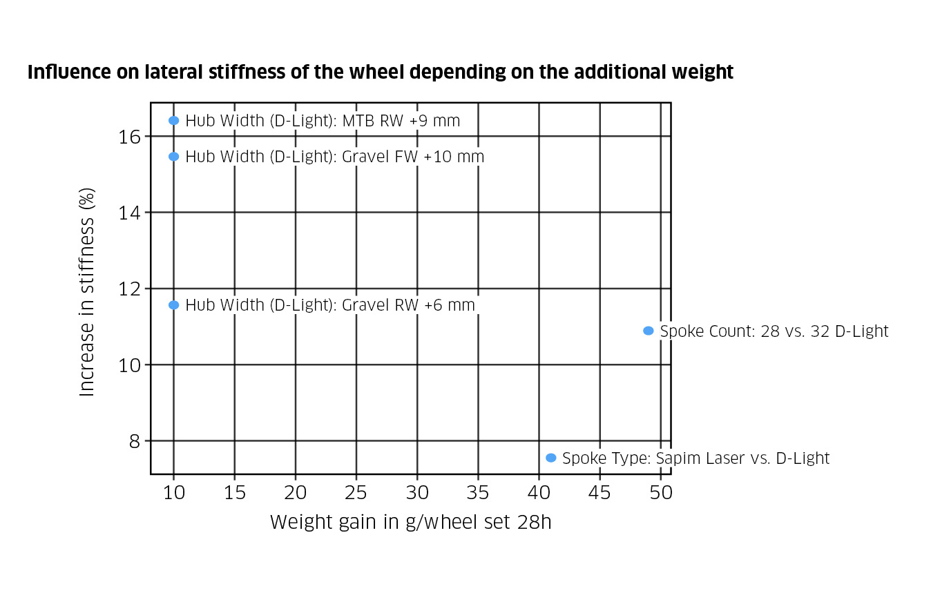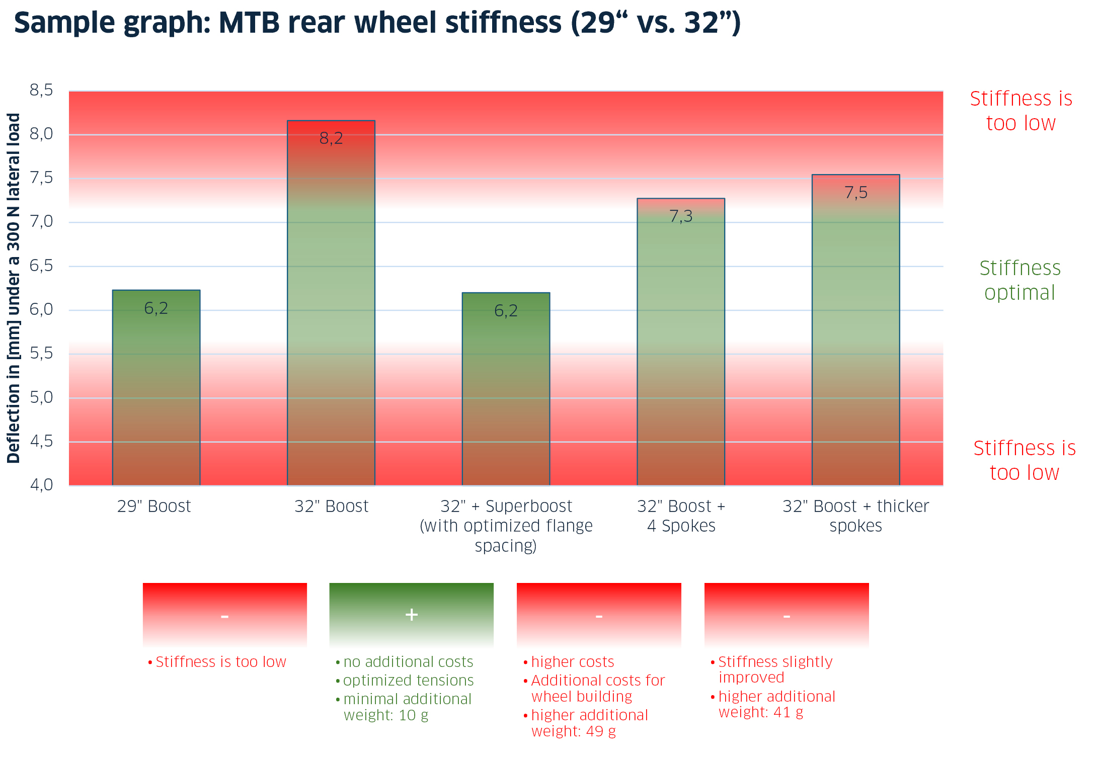 Now, the same problem is knocking on the door with the jump from 29 to 32 inches. Quite literally, as a look at the standardized ETRTO measurements reveals. While the jump from 26 to 29 inches was 63 millimeters, this time it is 64 millimeters from 29 to 32 inches. However, „bigger“ doesn’t just mean more speed; unfortunately, it also means more weight and, on top of that, less stiffness. These „big wheels“ flex a significant 31 percent more under the same lateral load.