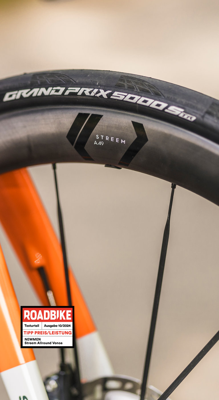 Mit unserem Streem Allround VONOA erübrigt sich die Frage nach Berg-Laufrad oder Aero-Modell. Sie vereinen beides in einem. Sie sind die Carbon-Laufräder, um sie alle abzuhängen. Auf jedem Terrain, bei allen Geschwindigkeiten. Beim Streem Allround mit 49 mm hohem Vorderrad und 54-mm-Felge hinten drücken 15 bzw. 18 VONOA Carbonspeichen das Gewicht auf 1300 Gramm Gesamtgewicht. Mit 24 mm Maulweite und 33,5 mm Außenbreite ist der Streem Allround optimiert für 32 mm breite Reifen und erreicht selbst damit bessere Windkanal-Ergebnisse als viele seiner Konkurrenten mit 28-mm-Pneus. Die Vorteile von breiteren Reifen liegen auf der Hand: Mehr Grip, mehr Komfort, geringer Rollwiderstand.